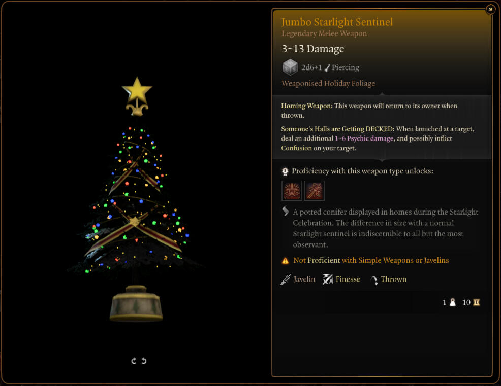 The Jumbo Starlight Sentinel furniture item ported from FFXIV as a throwable weapon, which may cause confusion. With thanks to the amazing KoboldJuno for assistance with the custom weapon passives.This is a joke mod based on a gif frequently used in the Faerun Fashionistas Discord server by Char.